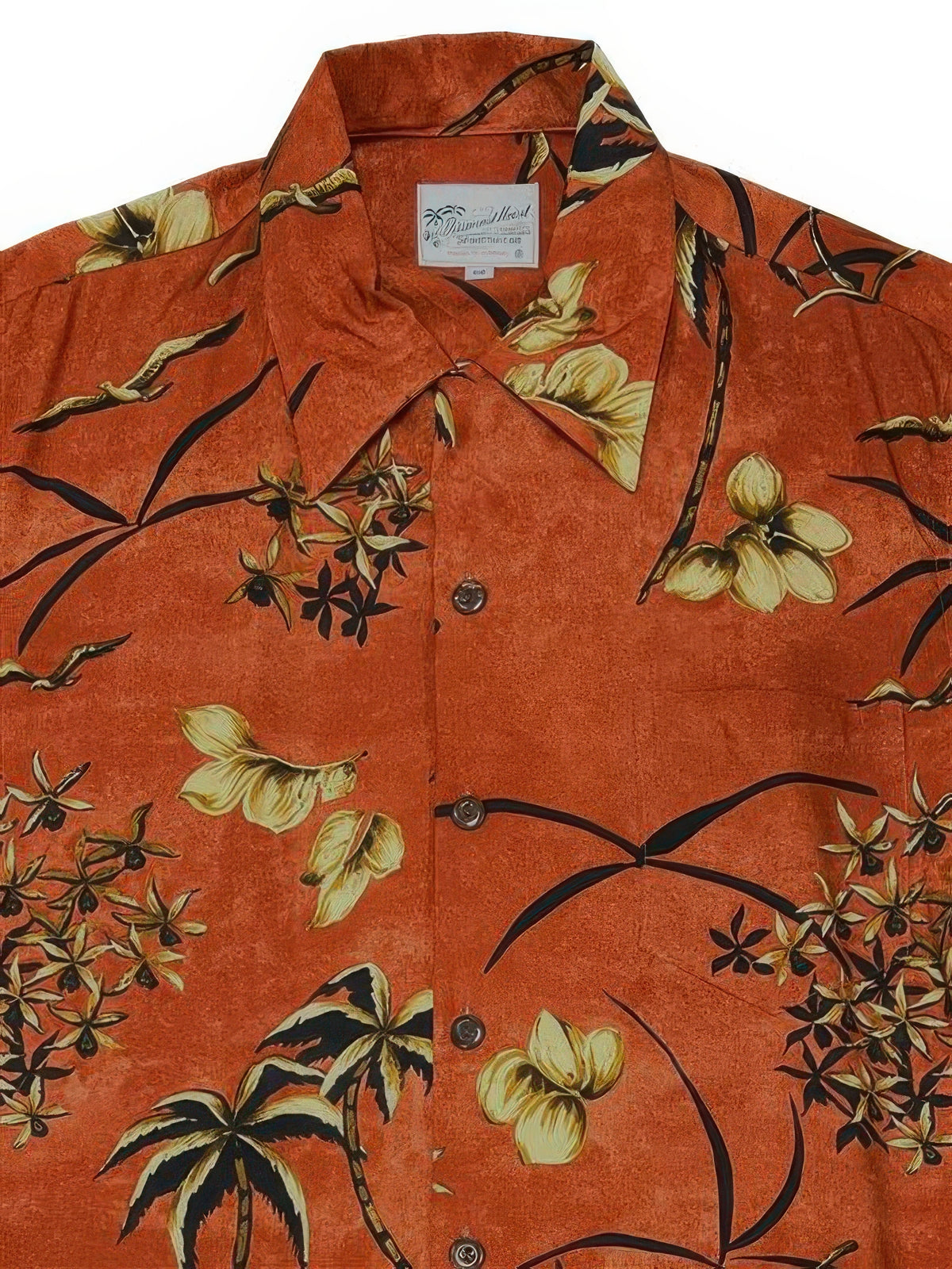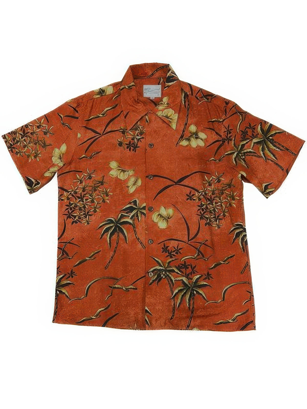 Welcome to paradise! This retro-inspired Vintage Oasis rust shirt by Diamond Head Sportswear shirt gives you a tropical escape with its vibrant palm trees and silhouettes of soaring night birds done in warm vintage-style artwork. Uniquely crafted for an old-Hawaii-inspired feel, this handsome shirt is sure to put you in an aloha state of mind. This enchanting Aloha shirt is made of 100% rayon and has a matched pocket and real coconut buttons.