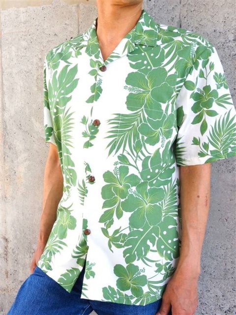 Royal Hawaiian Creations - Hibiscus Panel Green Poly Cotton Men's Hawaiian Shirt