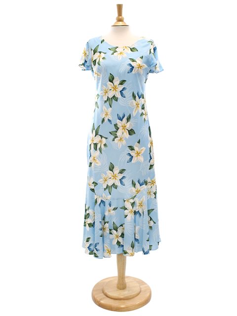 Two Palms - Plumeria Light Blue Rayon Hawaiian Long Dress
